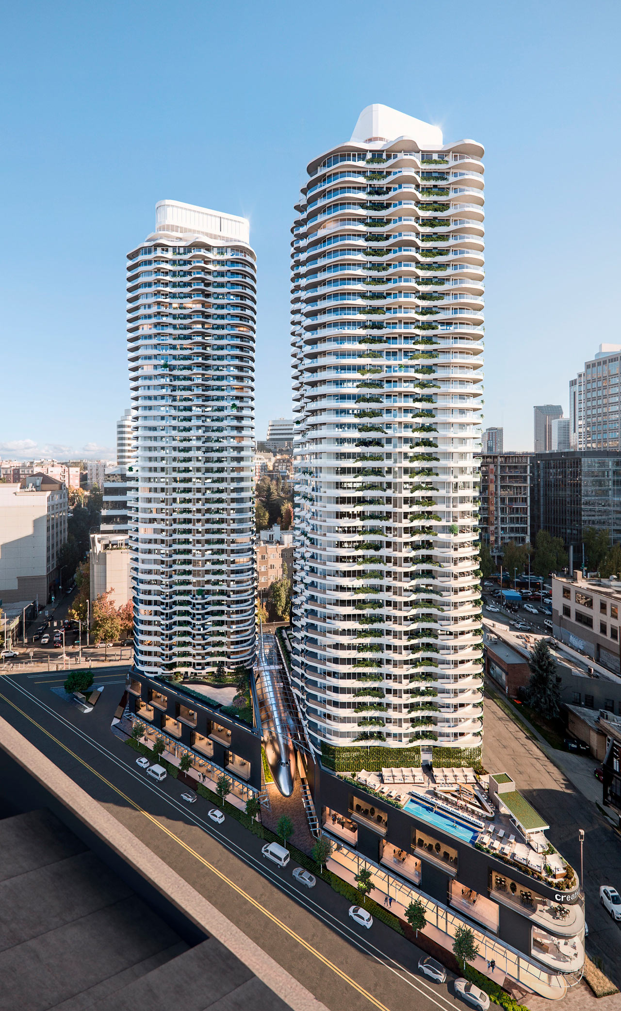 WB1200 marks a new gateway into downtown Seattle, anchoring the Denny Triangle with a bold mixed-use presence. Located at 1200 Stewart Street just off I-5, the project combines sculptural residential towers with an active street-level experience, creating a place where architecture, movement, and daily life intersect.